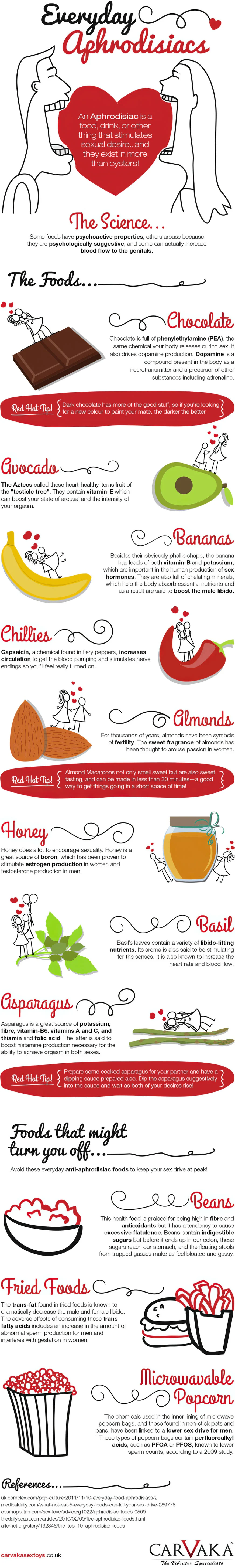 An aphrodisiac is a food, drink or anything else that stimulates sexual desire. You may have heard of the enchanting powers of dark chocolate, bananas or chillies, but what about basil or asparagus? Here are foods and drinks that delight, as well as those that may send one running.